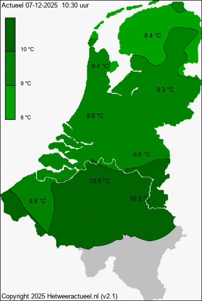 Het kaartje met de actuele temperatuur wordt iedere 10 minuten opgebouwd uit de actuele gegevens van alle weerstations, mits de data minder dan 1 uur oud is.